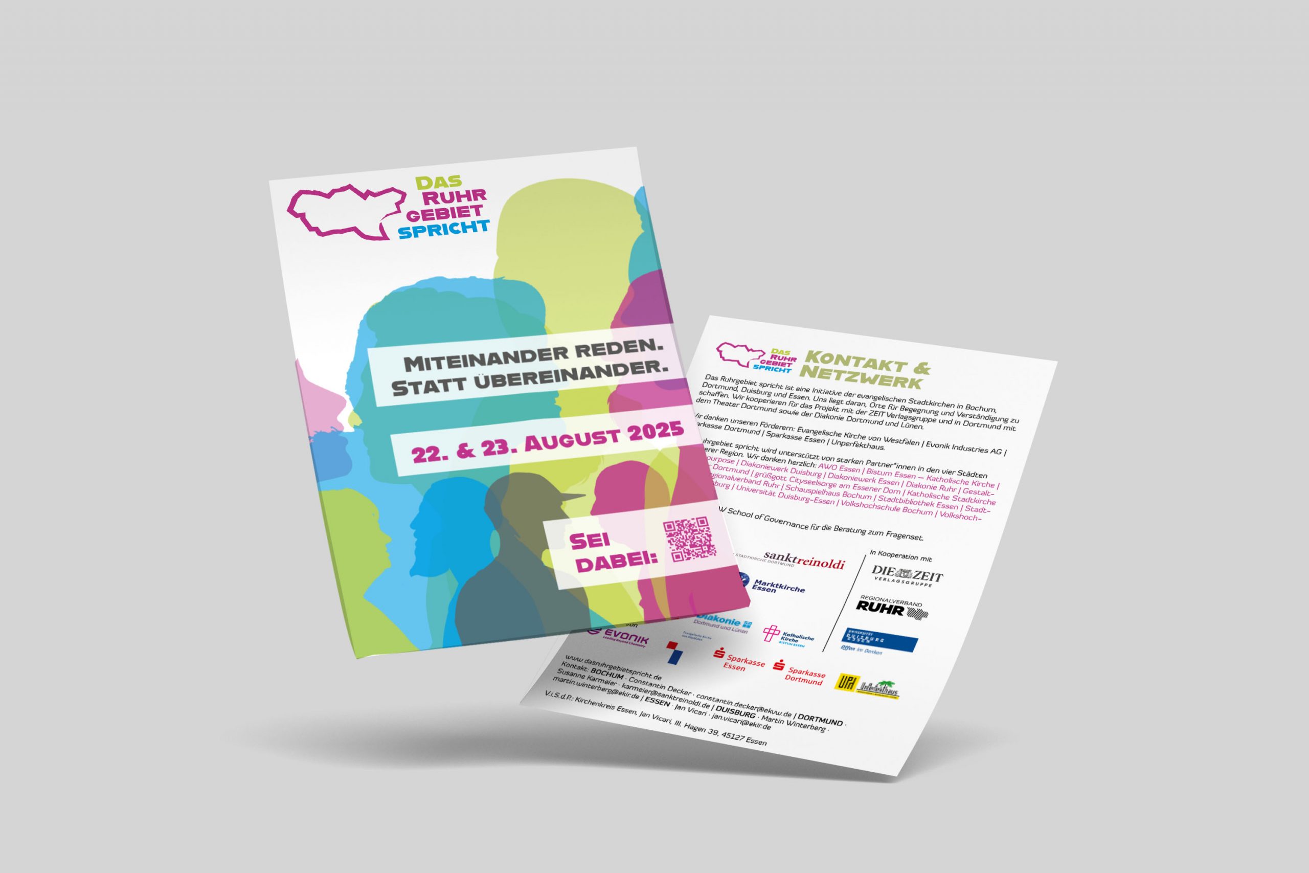 Vier Ruhrgebiets-Kirchen. Eine Idee: Wie beim „Deutschland spricht“-Projekt der Wochenzeitung ZEIT ging es darum, Menschen zum Miteinander sprechen zu bewegen. Zu viel Nebeneinander und Übereinander und zu wenig gegenseitiger Austausch – dieser gesellschaftlichen Entwicklung stellten sich die evangelischen Stadtkirchen aus Dortmund, Bochum, Essen und Duisburg im Sommer 2025 entgegen. Initiiert von Stadtkirchenpfarrerin Susanne Karmeier kamen dann auch allein in Dortmund fast hundert Menschen an einem Samstag vormittag vor dem Opernhaus öffentlich ins Gespräch. Wir haben dazu eine entsprechend vielfältige Grundgestaltung geliefert.